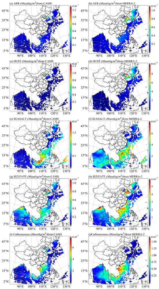 The spatial distribution of aerosol column mass density over the ocean within the FY-4B/GIIRS observation range on 10 April 2023, as derived from CAMS and MERRA-2. Panels (a,b) depict the total aerosol column mass density (sum of dust, sea salt, sulfates, and carbonaceous aerosols) from CAMS and MERRA-2, respectively. Panels (c–j) illustrate the spatial distribution of column mass densities for different aerosol types from the two datasets.