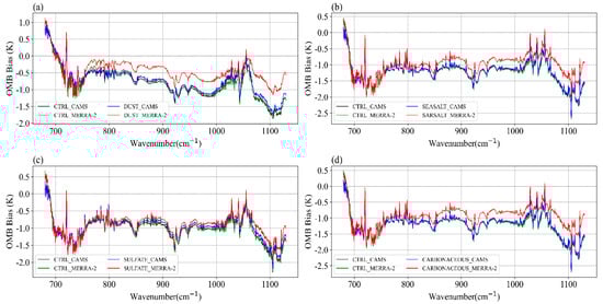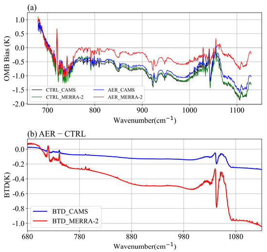 - As shown in Figure 6a, both CTRL_CAMS (black line) and CTRL_MERRA-2 (green line) display negative biases across all long-wave infrared channels of the GIIRS, with the CAMS containing 4209 points and the MERRA-2 containing 7500 points. The average OMB bias for CTRL_CAMS is −0.94 K, while for CTRL_MERRA-2 it is −0.96 K, with the values being very close. The maximum bias occurs in channel 679 (1105 cm⁻1), reaching −2.17 K. The errors in the ERA5 atmospheric and surface data can indeed affect the BT simulation results from ARMS [60,61]. However, in regions affected by dust storms and other areas with high concentrations of coarse aerosol particles, the errors introduced in the BT simulations are relatively small. For example, Niu et al. [62] used ERA5 atmospheric and surface data as input parameters for RTTOV to simulate the BT of FY-4B/the GIIRS under clear-sky conditions. Their results showed that the error range was between 0 and 1 K, which is consistent with the CTRL_CAMS and CTRL_MERRA-2 results presented in Figure 6a of this study;