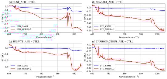 Comparison of BTD between the CTRL and AER experiments in the 680–1130 cm⁻1 region for GIIRS, including the contributions of four aerosol types: (a) dust, (b) sea salt, (c) sulfates, and (d) carbonaceous aerosols. The calculation regions are averaged within the respective high-quality aerosol density regions for the four aerosol types from both the CAMS and MERRA-2, highlighting the areas with significant aerosol presence for each type.