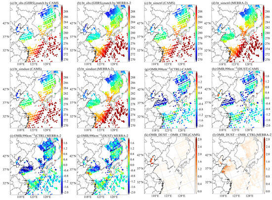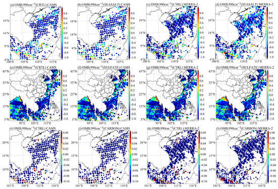 Spatial comparison of OMB between the aerosol experiments and the CTRL experiment for CAMS and MERRA-2, focusing on high column mass density regions of the other three aerosol types at the 990 cm⁻1 channel on 10 April 2023: (a–d) sea salt region, (e–h) sulfate region, and (i–l) carbonaceous region.
