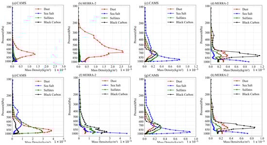 The aerosol mass density profiles, averaged within their respective high-quality density regions for the four aerosol types from CAMS and MERRA-2, are compared in the following panels: (a,b) dust region, (c,d) sea salt region, (e,f) sulfate region, and (g,h) carbonaceous region.