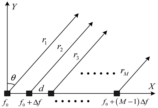 Consider the monostatic linear frequency offset FDA radar shown in Figure 1, which consists of M transmitter and receiver co-located antennas that are horizontally aligned in a straight line with uniform spacing d to form a one-dimensional uniform linear array. Compared with the conventional phased array radar, the significant characteristic of the FDA radar is the existence of a small frequency offset in the carrier frequency of the adjacent array elements, which forms a unique frequency modulation characteristic during transmission.