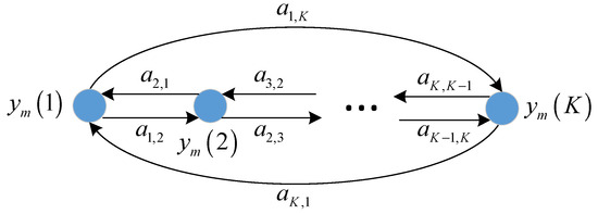 The foremost task in this study is the construction of an appropriate graph model for the aforementioned FDA, which serves as a critical foundation for subsequent derivations. Based on the definitions given in Section 3.1 and taking into account the topological structure of the FDA, a cyclic directed graph, as illustrated in Figure 4, is initially constructed. Specifically, the graph signal is denoted as , and the elements of this vector are determined by Equation (13), in which the vertex set represents the nodes of the array, and the edge set represents the signal correlation within the phase domain across the array. Herein, we construct a sparse adjacency matrix denoted as A instead of the edge set, since the constructed graph is directional. Comprehensively considering the graph topology, degrees of freedom, and computational complexity, the adjacency matrix A is formulated as detailed in Equation (17).