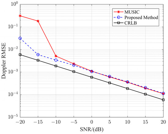 Next, the root mean square error (RMSE) of Doppler estimation is compared between the MUSIC algorithm and the proposed method under different SNRs. The SNR is −20~20 dB, and the RMSE is expressed as follows:
