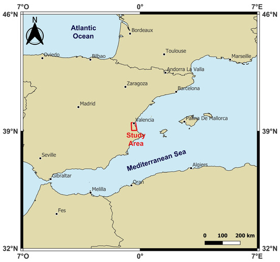 Valencia, located on the eastern coast of Spain (as shown in Figure 1), lies geographically at the confluence of the Turia River to the north and the Júcar River to the south. The surrounding region is characterized by a coastal plain that extends up to 50 km inland, bordered by mountain ranges with an average elevation of 1000 m [51].