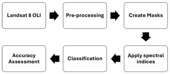 The workflow for this study (Figure 3) consisted of four main steps, following an initial preprocessing phase: mask creation, application of spectral indices, classification, and accuracy assessment.