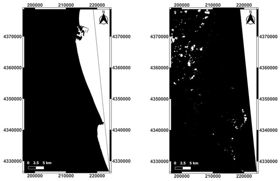 Sea mask on the left: the black areas represent terrestrial and potentially flood-affected zones, while the white areas correspond to excluded marine regions. Cloud mask on the right: white areas represent cloud-covered regions excluded from the analysis, while black areas indicate cloud-free zones included in the study.