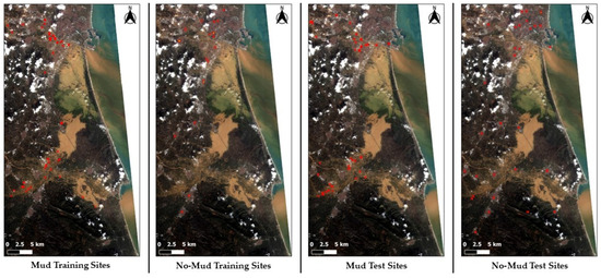 Spatial distribution of training and test sites used for classification. The red points represent selected locations for Mud and No-Mud classes. The first two images illustrate the training sites, while the latter two depict the test sites.