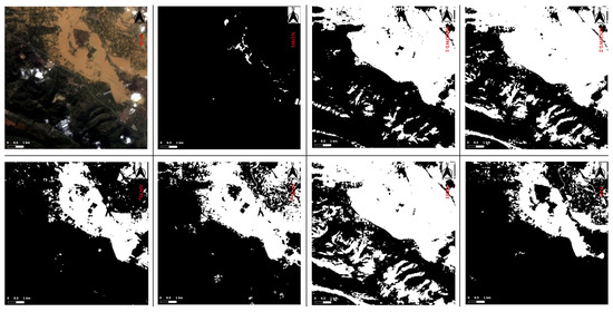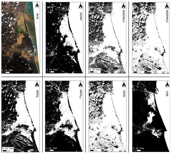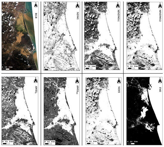 Before delving into quantitative evaluations, a preliminary visual analysis of the spectral indices, shown in Figure 7, was conducted to assess their ability to delineate flooded areas.