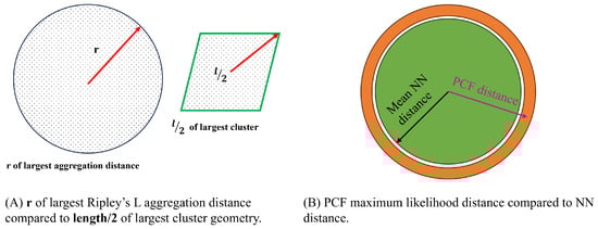 To compare HDBSCAN to the increasing quadrat dimensions and interpretations of clustering from the Morista Index, we qualitatively demonstrate the correspondence between the varying HDBSCAN cluster dimensions and the scales of interaction estimated from the Morista Index plot. Because Ripley’s L-function is a calculation with a radius r from some arbitrary point i, we employ of the largest cluster dimension and contrast this to the farthest significant deviation from randomness as suggested from the simulation envelopes. In principle, the radius observed by using the apex point feature within the largest cluster in the ZOI is being analyzed in comparison to the largest radius delineated by Ripley’s L-function. In the case of the pair correlation function, the mean nearest neighbor distance from within the ZOI is evaluated against the maximal peak identified from the PCF to substantiate the HDBSCAN clustering. As the pair correlation function indicates the distance at which the likelihood of encountering similar features is maximized, the mean nearest neighbor distance affords a commensurate measure, positing that a radial buffer extended by a length of x units would, on average, intersect another similar feature (Figure 2).