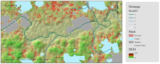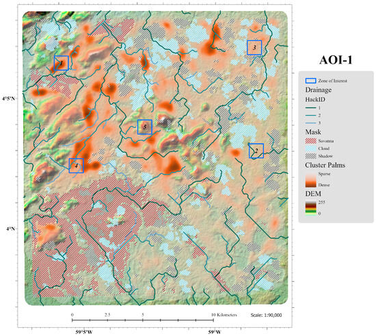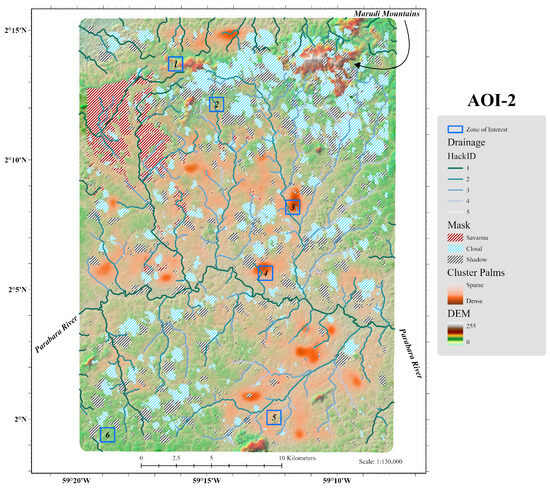 A potential first next phase for this research is the application of the HAND model [62] in order to properly delineate upland from flood-prone or flooded terrain, which would better describe the discrepancies seen in the coefficients for the drainage channels in AOI-1 and AOI-2. This would also serve to support the hypothesis from the logistic model, as does the observation of a lack of canopy-emergent palms surrounding the Parabara River, that the higher magnitude drainage channels in AOI-2 are more flood-prone compared to those in AOI-1. Other suggestions include subdividing areas into ecological zones for further analysis, possibly by the clustering of environmental parameters. In a smaller-scale area of interest, palm canopy diameters measured from satellite imagery may be of use for pattern or autocorrelation analysis.