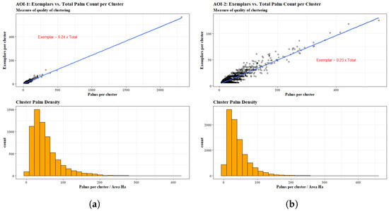 HDBSCAN-generated cluster-diagnostic metrics for AOI-1 (a) and AOI-2 (b). An exemplar feature is the most representative feature of a cluster based upon the underlying statistics; across all cluster size ranges, the proportion of exemplars is linear and approximately 20% of the total number of palms in the cluster. The density of the clusters is computed as the number of palms in a given cluster divided by the area of the cluster’s minimum bounding geometry polygon, in hectares.