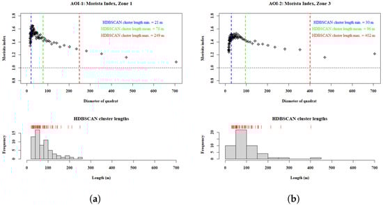 Example Morista Index plots from AOI-1 (a) and AOI-2 (b) with the summary and distribution of HDBSCAN clusters for comparison. The Freedman–Diaconis algorithm was used for histogram breaks due to differing cluster counts per ZOI. Where the Morista Index demonstrates variability in the locus of its aggregation scales, the HDBSCAN’s cluster size distribution correspondingly conforms, extending into the broader spatial scale in its tail-end. See Supplementary Figures S3 and S4 for Morista Index plots of all ZOI.