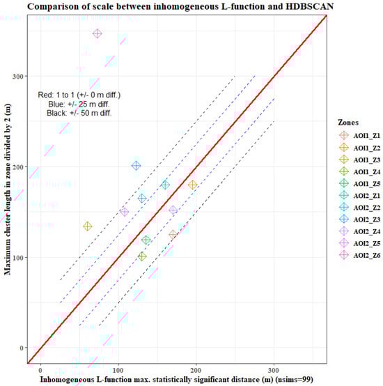 A comparison of the maximum potential extent of the aggregation behavior suggested by the inhomogeneous L-function versus the half-length of the maximum cluster size in each ZOI is presented as a cross-plot (Figure 7). The values for the distance of the L-function are taken as the maximum value greater than 0 and greater than the simulation envelope, as seen from a plot of the centered L-function (Supplementary Figures S5 and S6). From the cross-plot we can see that there is, overall, no visible high or low bias, with 4 of 11 ZOI indicating matches of scale within 50 m and 4 of 11 indicating matches of scale within 25 m. In total, 3 of 11 demonstrate high estimates of scale from the HDBSCAN geometry compared to the L-function. In particular, one single ZOI (AOI-2, Zone 6) exhibits a significant deviation in this context.