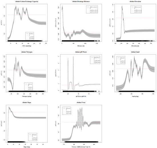 Information concerning key soil characteristics was obtained from SoilGrids 2.0 [37]. SoilGrids is a global-scale product of the International Soil Reference and Information Centre (ISRIC) World Soil Information Service that uses quantile regression forests, approximately 240,000 soil observations, and more than 400 environmental covariates to model soil properties at a resolution of 250 m. In this study, the soil properties examined were the cation exchange capacity (), the nitrogen content (), the pH of the soil (), the sand content (), and the volume of the soil water at −10 kPA [38]. Each variable was examined at a selected depth of 15–30 cm below the surface. The selection of these covariates was influenced by those used in [39].