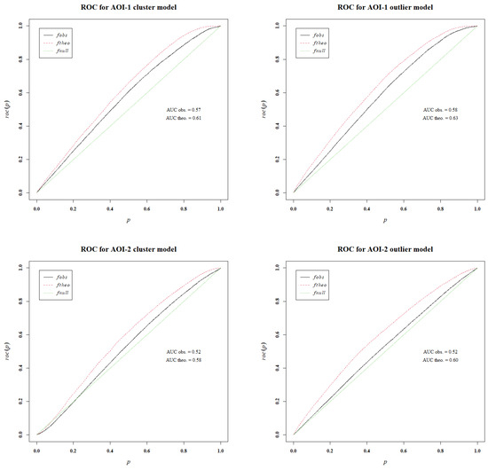ROC plots with AUC values for AOI-1 (top) and AOI2- (bottom). The observed AUC is the value of the actual model, while the theoretical AUC is the expected value of the model.