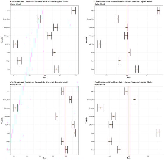 To select the most pertinent covariates, a stepwise model selection algorithm was employed, with the model built from a function of itself (null model) through all possible combinations of covariates, and each model’s Akaike Information Criterion was compared. In both AOI, the use of all covariates in both the cluster and outlier models yielded the lowest Akaike score (the best model). The confidence intervals for the coefficients were subsequently calculated from the model variance–covariance matrix.