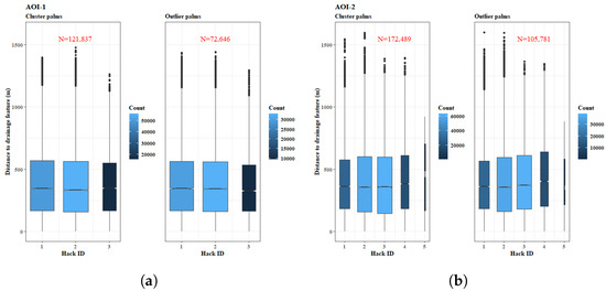 Comparison of the linear distance between individual palms in both the cluster and outlier sets versus the linear distance to the nearest drainage feature. (a): AOI-1 cluster and outlier palms; (b): AOI-2 cluster and outlier palms. Box plots are grouped by their Hack magnitude value (1 is the drainage feature with the highest magnitude, 5 is the lowest). Color shading and box widths are indicative of the overall number of palm features in each group. The overall number of features in each subdivision is annotated in red.