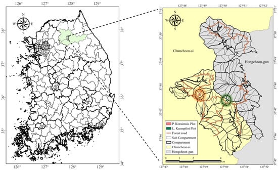 The study site was situated within the experimental forest of Kangwon National University, Gangwon Province, Republic of Korea (37°45′–37°51′N, 127°47′–127°52′W). Rectangular plots measuring 100 m × 100 m were established for each species, namely Pinus koraiensis and Larix kaempferi. The P. koraiensis plot contained 736 trees, whereas the L. kaempferi plot contained 480 trees, indicating a higher stand density in the P. koraiensis plot. The mean DBH was 28.6 cm for P. koraiensis and 28.3 cm for L. kaempferi. The slope of the P. koraiensis plot was 19°, whereas that of the L. kaempferi plot was 24°. L. kaempferi stands exhibited lower canopy and stand densities than P. koraiensis. Owing to its species characteristics, L. kaempferi allowed for greater light penetration through the canopy, resulting in enhanced development of understory vegetation (Table 1, Figure 1).