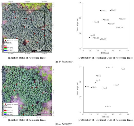 Ten reference trees were selected for each species. The reference trees were used as evaluation standards, with diameters measured at varying stem heights after felling. Reference trees were selected to represent an even distribution of DBH and height to ensure the assessment encompassed a diverse range of tree characteristics. The selection process was based on procedures used in Korean forest practices to identify reference trees. The trees were categorized by diameter class (2 cm increments) and height class (1 m increments), with random sampling performed within each group. If selected reference trees were located close to one another, they were excluded to account for felling logistics, and a new random sample was generated. This process ensured that the selected reference trees were evenly distributed regarding DBH, height, and spatial position within the study site (Figure 2).