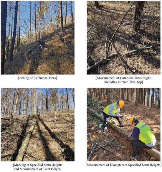 Data for reference trees were collected by measuring the diameters at various stem heights and directly measuring the actual tree height after felling. The stem diameters were marked and measured at 1-m intervals using a diameter tape. The actual heights of the trees were determined by measuring the heights of the stumps and stems using a measuring tape and summing these measurements. If a treetop was broken during felling, the actual tree height was calculated by adding the stump height, stem height, and broken treetop height (Figure 5).
