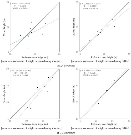 Moreover, R2 revealed a more robust correlation between LD and RTD heights. For P. koraiensis, the R2 value for the LiDAR-based height was 0.95, which was approximately 0.4 higher than that of 0.56 for the Vertex-based height. For L. kaempferi, the R2 value for the LiDAR-based height was 0.98, which was higher than that of 0.82 for the Vertex-based height. These results indicate that LiDAR-based height measurements provided more consistent predictions and higher accuracy than conventional trigonometric-based height measurement methods for both species (Figure 7).