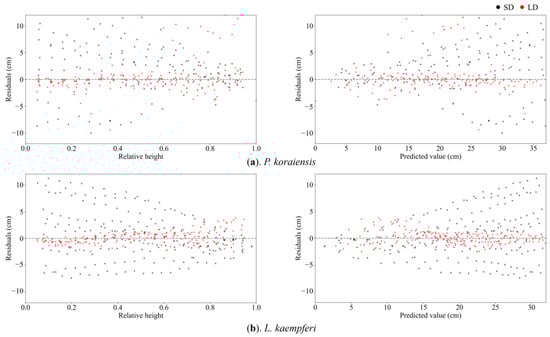 The residuals of the stem diameter at different heights were analyzed for each species using the estimated taper curves, with the RTD taper curve serving as the reference. The RMSE values of stem diameter at different heights, calculated against the RTD, were 5.55 cm for SD and 2.97 cm for LD in P. koraiensis and 4.48 cm for SD and 1.18 cm for LD in L. kaempferi; this suggests that the accuracy of the diameter estimation was greater for L. kaempferi, which had a more linear stem and fewer branches than P. koraiensis. Concerning the data type, LD demonstrated superior performance compared to SD.