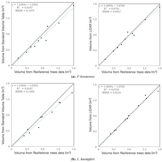Nevertheless, the LiDAR-based volume estimation model presented in this study was exclusively tested on specific species, particularly conifers, highlighting the need for further validation across a broader range of species. Nevertheless, the findings of this study demonstrate that the LiDAR-based model is highly effective for accurately estimating the volume of trees with straight stem shapes suitable for timber production.