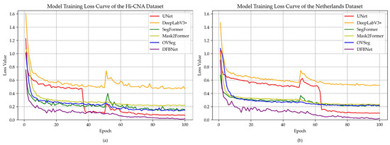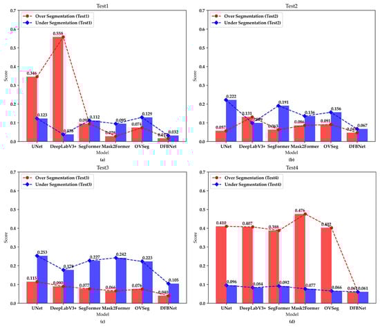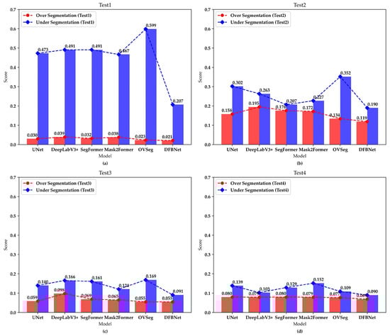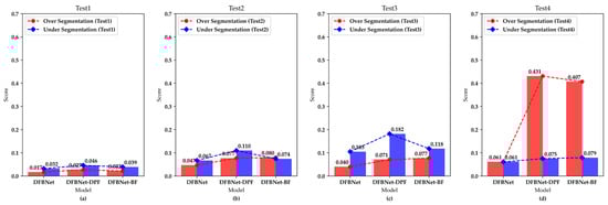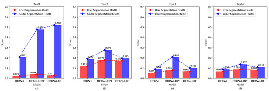 The computational efficiency of DFBNet was assessed to evaluate its practicality in real-world applications. On an NVIDIA GeForce RTX 2080 Ti GPU, the model processed a single 512 × 512 image in approximately 120 ms, demonstrating near-real-time processing capabilities. The peak GPU memory usage during segmentation tasks was 8.1 GB, which aligns with the requirements of typical high-performance systems. In addition to runtime and memory usage, we also calculated the FLOPs (floating-point operations per second) and the number of parameters for DFBNet to provide a more detailed perspective on its computational complexity. FLOPs and parameters are essential factors in understanding a model’s efficiency, as they directly impact the computational resources needed during both training and inference. DFBNet, with 100 GFLOPs and 35 million parameters, is optimized to balance segmentation accuracy with computational demand.