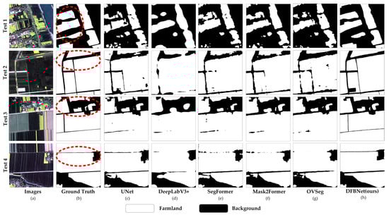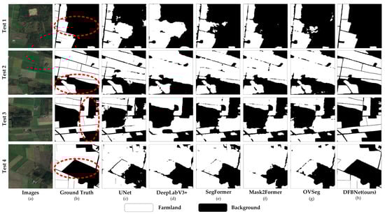 - Anti-Interference Capability: When faced with complex background interference in remote-sensing images, such as shadows, weeds, and differences in farmland morphology, DFBNet exhibits strong anti-interference capability. Its dual-branch feature learning and progressive boundary refinement processes allow the model to distinguish essential features of farmland from interference factors. As a result, it reliably identifies farmland areas even in challenging environments, providing accurate boundary information. This robustness offers significant technical support for monitoring farmland boundaries in practical agricultural production.