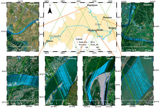 Six study sections (virtual stations) with different river widths and geomorphological features were established along the middle and upper reaches of the Yangtze River in this study, and the virtual station is defined at the intersection between the satellite reference ground track and the river centerline. From west to east, four sections, including Zhutuo, Zhicheng, Shashi, and Hankou, are located on the main stream of the Yangtze River, while two sections, including Jingziguan and Huantan, are situated on tributaries. The Sentinel-6 overpass trajectories for each section are illustrated in Figure 1. The details of the in situ data and river widths are provided in Table 1.