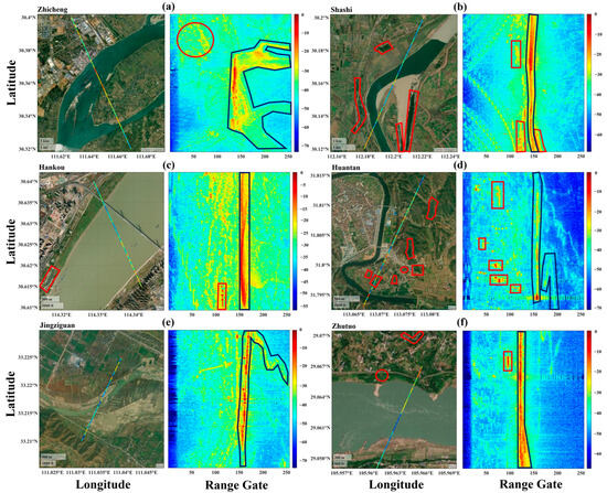 This study utilizes Sentinel-6 1280 Hz data, which contains more information for analyzing waveform features. The satellite images (left) and radargrams (right) for each study section are presented in Figure 2. The dark blue boxes indicate river surface signals, where the river morphology is evident, and the river water surface signals can be determined. Interfering signals can be categorized into two types; one is the non-river surface signals represented by ponds (red boxes), which have high strength but are discontinuous in the azimuth direction and can distinctly separate from river surface signals in the range direction; the other is the interfering signals from the surface of river represented by sandbars and bridges, which are high in intensity, and more continuous in the azimuth direction, neighboring with the river water surface signals in the range direction, and generally appearing shaded in radargrams, making it difficult to distinguish between them. As shown in Figure 3, the radargrams of the Shashi section reveal the river’s complex echo signals, numerous and strong interfering sub-wave peaks, and the continuity of the river water surface sub-wave peaks (red retracking line).