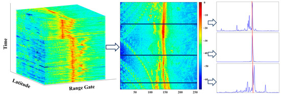 Overall, in the azimuth direction, the river exhibits the most continuous morphology among the landforms in the study area. Therefore, the river water surface signals (manifested as sub-wave peaks) are usually more numerous in the overall waveforms relative to the irregular disturbing objects. In the range direction, echo signals from different objects can be distinguished in each waveform, determined by the radar altimeter’s pulse scattering mechanism. Consequently, there will be higher frequencies concentrated within a certain range, and the continuity of sub-wave peaks, representing different echo signals, will also be manifested in the azimuth direction of the waveforms (see Figure 3). Thus, the sub-wave peak signals of the river water surface have the highest continuity, especially after the high posting rate of FF-SAR processing. The number of waveforms has greatly increased, and the above waveform features will be more significant.