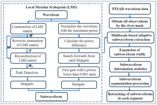 - To extract multi-scale adaptive sub-wave peaks to accurately identify multiple strong sub-wave peak signals from each waveform based on the Local Maxima Scalogram (LMS) method [23] The key of this method is to construct an local maxima matrix for each waveform. The extraction process is as follows:Step 1: Calculate the local maxima of the waveform using a moving average window, where the window length varies according to . The local maxima for different window lengths : are determined by (1):where is a random number in the range [0, 1], is the -th waveform in the along-track direction, and is the power waveform. L = 5 is the optimal setting for peak detection in this study. The values of , at and are set to . Based on this, a local maxima matrix can be constructed.Step 2: Calculate the sum of each row of the local maxima matrix , denoted as .The row-wise summation contains information about the scale-dependent distribution of zeros (thus, local maxima). The global minimum of , denoted as , represents the dimension with the most local maxima. Additionally, use to reorganize the local maxima matrix LMS by removing all elements that satisfy , resulting in a new matrix .Step 3: To determine the peaks of the waveform by calculating the column-wise standard deviation of each column of the matrix according to (3).The index that satisfies represents the bins of the detected peak. This value is designated as the stopping point of the sub-waveform . For each waveform, can be determined.Additionally, to determine the starting point of each sub-waveform, the waveform is normalized with the maximum power. Subsequently, the power difference of the normalized waveform’s consecutive gates is calculated to obtain the power difference waveform. Finally, for each sub-waveform stopping point , the power difference waveform is searched from back to front. The first gate with a power value below 0.001 is identified as the corresponding sub-waveform starting point .Following the aforementioned steps, the same search is performed for all sub-waveform stopping points in , and ultimately, the sub-waveform starting points are calculated, forming N sub-waveforms together with . Considering that some situations may have sub-waveform widths of only 2–3 bins, which are too narrow for retracking calculations, it is necessary to extend several bins forward or backward to form new sub-waveforms. Previous studies have demonstrated that a sub-waveform width of at least five bins is optimal [24,25]. Therefore, the difference between the end and start gates is calculated to verify the sub-waveform length. For special sub-waveforms, two bins are extended either backward or forward;