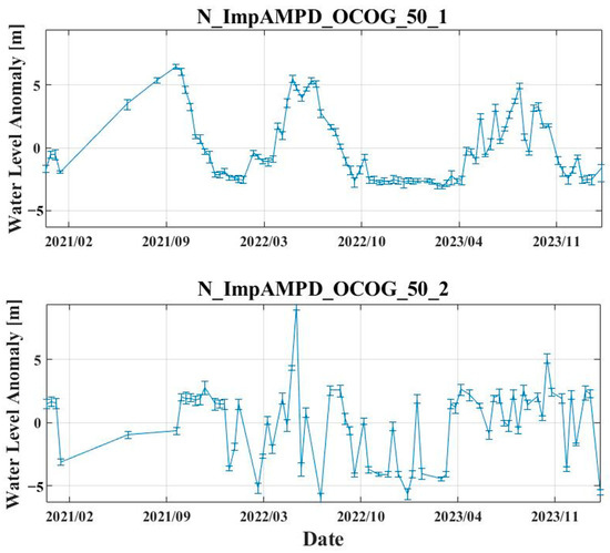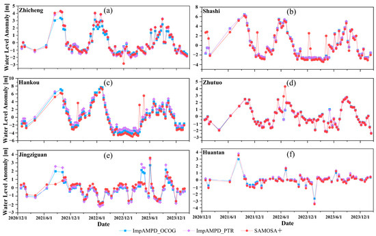 Figure 8 illustrates the river level time series obtained by the ImpAMPD and SAMOSA+ retrackers for different virtual stations. The monitored water levels have been zero-mean normalized, and the relative water levels at observation points greater than 0 m are higher than the average water levels during the monitoring period, and the values below 0 m are lower than the average water levels.