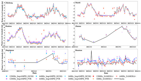 In this study, we obtained and compared the accuracy of various retrackers (ImpAMPD, OCOG, PTR, SAMOSA+) in different study sections and at different posting rates, and the accuracy validation results are detailed in Appendix A. Table 2 demonstrates the results of the retrackers with the best accuracy at each virtual station. The comparison of the river level time series for each retracker with the in situ data are shown in Figure 6, and the comparison of the correlations is shown in Figure 7.