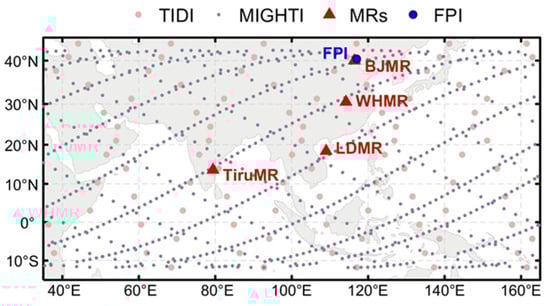 The locations of all the ground-based instruments used in this study are shown in Figure 1. In the comparison between MIGHTI and meteor radars, we applied a spatiotemporal window of 300 km and 30 min to each meteor radar measurement and interpolated the MIGHTI data in altitude to the meteor radar altitudes by spline interpolation. For the Ledong, Wuhan, and Beijing meteor radar systems, we interpolated the MIGHTI wind speeds in the altitude range of 92 to 110 km, with intervals of 2 km. Since the Tirupati meteor radar data used here covers an altitude from 91.5 to 104.5 km with a resolution of 1 km, for consistency with the data from the other three sites and ease of subsequent processing, we averaged the data for each pair of adjacent altitudes to represent the wind speed at the interpolated intermediate altitude. For example, averaging the data at 91.5 km and 92.5 km results in a wind speed of 92 km.