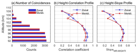 There were 3421 points that met the filtering criteria in total. We conducted a statistical analysis of these points in terms of altitude. As the altitude increases, the available data from meteor radars decreases, which may be attributed to the lower density of meteors above 100 km, resulting in a reduction in the number of coincidences between the two instruments. We calculated the correlation coefficients for MIGHTI and meteor radar observations at each altitude and performed linear fits using the least squares method. The changes in correlation coefficients and fit slopes with altitude are shown in Figure 2b and Figure 2c, respectively. It can be observed that the correlation is highest at around 94 km (with correlation coefficients of 0.857 and 0.813 for the zonal and meridional wind components, respectively). Additionally, there is good consistency between MIGHTI and the meteor radar at 92 km, indicating that the newly extended observations by MIGHTI at around 91 km exhibit satisfactory quality. With increasing altitude, the number of coincident points and the correlation between the two instruments decreases due to the reduced availability of meteor radar data. This may be attributed to the fact that the quality of meteor radar data above 100 km experiences the effect of meteor density. The distribution of meteor trails with altitude is affected by atmospheric density, the angle at which the meteoroid enters the atmosphere, and the frequency used by the meteor radar, with a maximum at around 90 km [33]. To avoid sensitivity to outliers with fewer samples, we restricted the comparison to coincidences within the 92–100 km altitude range.
