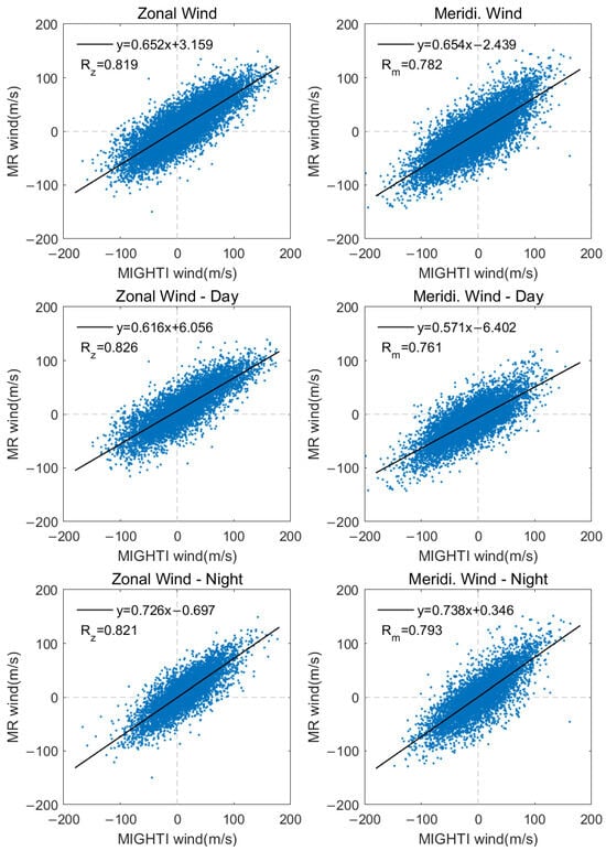From Figure 3, it can be observed that during both the daytime and night-time, the correlation of the zonal wind component is higher than that of the meridional wind component. Zhou et al. [20] illustrated the limited precision of MIGHTI’s meridional wind data through a comparison with the Wuhan meteor radar data throughout 2020 and employed a statistical approach proposed by Hawking et al. to compare geophysical data from multiple instruments with varying levels of accuracy.