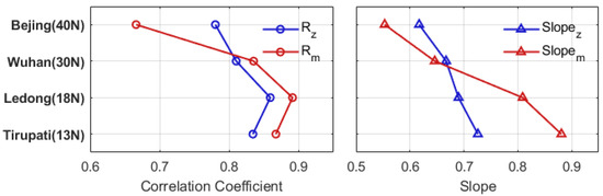 Variation of correlation coefficients and fitted slopes for MIGHTI with different meteor radar sites.