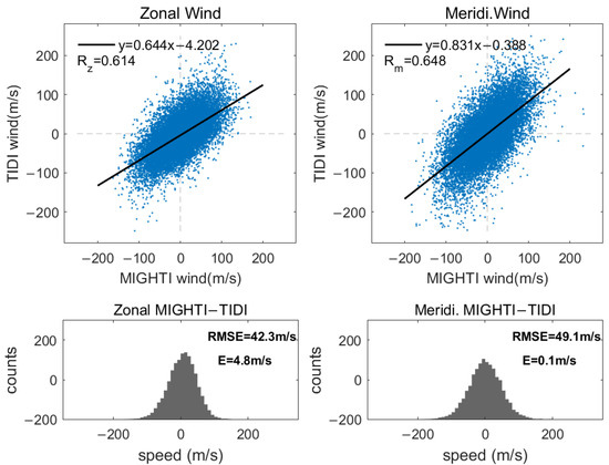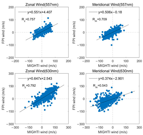Approximately 788 coincidences were obtained at ~96 km (557 nm), and around 654 coincidences were obtained at ~250 km (630 nm). The scatter plots are shown in Figure 5. Generally, there is good consistency, with the correlation in the zonal wind field generally better than that in the meridional wind field, especially in the observations at 630 nm, where the correlation coefficient is only 0.554. This can also be explained by the spacecraft’s motion near the observation boundary.