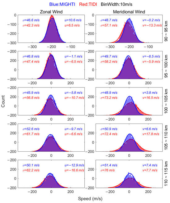 The wind speed distributions with an interval of 10 m/s in each altitude range (shown in the right column). Blue indicates MIGHTI winds. Red indicates TIDI winds. The darker blue indicates the overlapping region of two datasets. In each panel, σ represents the variances, while u and v represent the means of zonal winds and meridional winds, respectively.