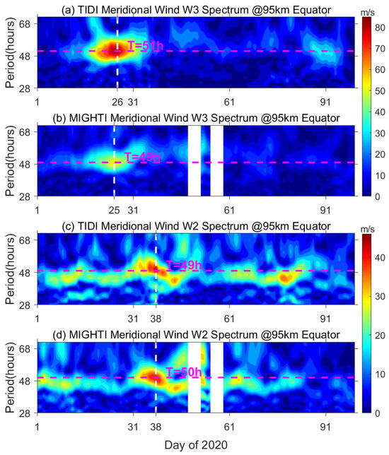 Temporal variations of the spectra for the quasi-two-day waves (Q2DWs) with westward zonal wavenumber 3 in the (a) TIDI and (b) MIGHTI meridional wind data, as well as westward zonal wavenumber 2 in the (c) TIDI and (d) MIGHTI meridional wind data at the equator and 95 km, during days 1 to 100 of 2020. The white dashed lines indicate the center day of the event, and the pink dashed lines indicate the exact periods.