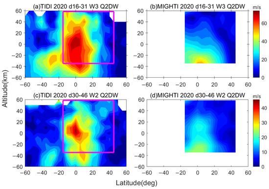 Amplitudes of W3 Q2DWs in meridional wind from days 16–31 of 2020 in a latitude-altitude depiction estimated from (a) TIDI and (b) MIGHTI. Similar images show W2 from day 30–46, estimated from (c) TIDI and (d) MIGHTI. Pink rectangles indicate the same coverage height and latitude as MIGHTI.