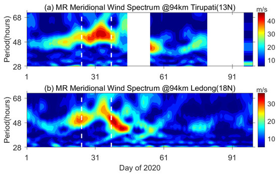 Temporally varying spectra of westward planetary waves in (a) Tirupati and (b) Ledong meridional wind data at 94 km during days 1 to 100 of 2020. The white dashed lines indicate the center days of the events estimated in the space-borne instrument.