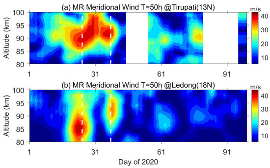 The amplitude variation of Q2DWs in time-altitude depiction from day 1–100 of 2020, estimated from (a) Tirupati meteor radar and (b) Ledong meteor radar meridional observations. The white dashed lines indicate the center day of the events estimated in the space-borne instrument.