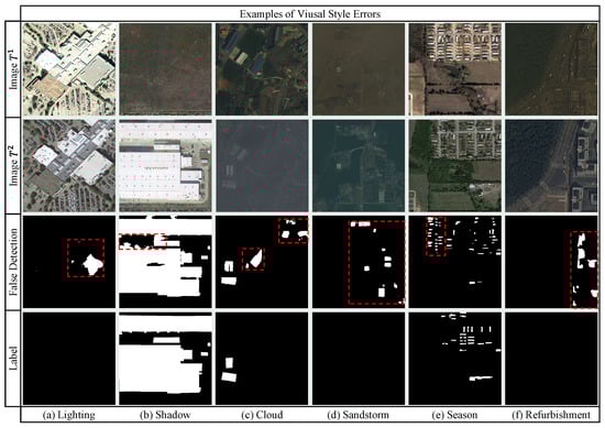 A persistent challenge in optical remote sensing CD is visual style interference caused by radiometric, seasonal, and phenological variations [20,35]. While specialized datasets like LEVIR-CD+ [9] and S2Looking [10] improve adaptability, feature enhancement strategies dominate current solutions, including difference amplification [12], multi-level fusion [19], and global semantic integration [30]. Techniques such as multi-level difference enhancement [36] and similarity-aware attention networks [37] aim to suppress false positives, yet critical gaps persist: (1) inadequate constraints during Siamese feature extraction hinder consistent feature contrast in complex backgrounds, and (2) robust protocols for quantifying style interference errors remain underdeveloped. Traditional and deep learning methods struggle to disentangle style variations from genuine changes [7], while existing datasets lack real-world heterogeneity [11,13]. This limitation perpetuates false detections in scenarios with large visual style differences (Figure 1), underscoring the need for systematic feature constraints and standardized evaluation metrics [14,15,16,17,18].