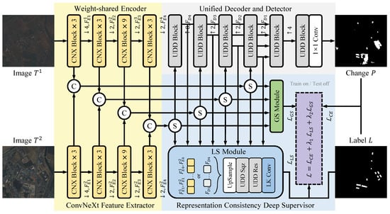 We propose the Representation Consistency Change Detection (RCCD) framework (Figure 2), a cross-visual-style CD method tailored for bi-temporal images. Unlike conventional Siamese encoder–decoder networks, RCCD incorporates a novel representation consistency deep supervision approach during training. This approach applies additional supervision to multi-scale features at each encoding and decoding stage, additional assessing the similarity between bi-temporal pyramid features extracted by the backbone network, considering both local spatial and global stylistic characteristics. The encoder utilizes the pre-trained model for robust feature extraction. We introduce a unified basic feature compression unit (UDD) for both the decoder and detector, enabling efficient dimensionality reduction and feature fusion. Finally, the detector outputs a binary change mask aligned with the input image dimensions.