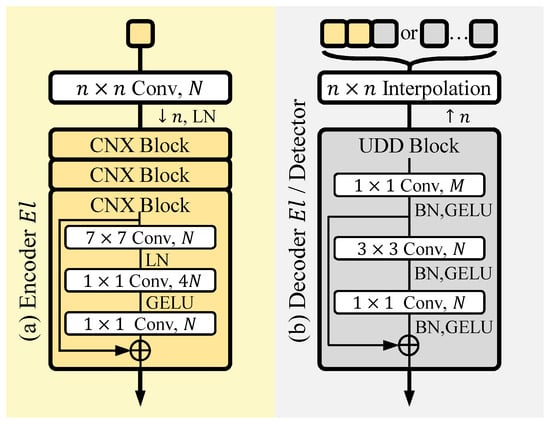 Details of CNX and UDD blocks in various stages of the encoder, decoder, and detector.