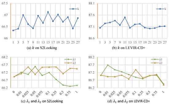 Figure 7c,d analyze the effectiveness of loss function hyperparameters and in Equation (8). Optimal weights for the LS and GS modules need to be adjusted for different datasets. We sampled values for both weights (0 to 1), keeping other parameters fixed at 0 and adjusting either or individually. Results show incorporating the LS or GS module within a certain range improves accuracy. On S2Looking (more pronounced global style differences), the GS module generally outperforms the LS module. Conversely, on LEVIR-CD+ (greater local content variations), the LS module performs better. Since both types of variations are typically present, fine-tuning the loss function weighting is necessary. The principle is to select the minimum weights that still yield performance improvements, avoiding negative effects from excessively large weights.